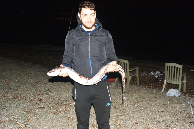 Yılan balığını görünce şaşıran Ali Tunca, “Ben 10 yıldır hobi olarak olta balıkçılığı yapıyorum. Hayatımda ilk defa bu büyüklükte bir yılan balığı yakaladım. Oltama balık takılınca büyük olduğunu anladım. Bu balığı kıyıya çekmek için yarım saat uğraştım. Bu tür balıklar bu bölgede bol, ama bu büyüklükte daha önce çıktığını duymadım. Balığın boyu 1,5 metre. Kilosu da 5 kilo civarında” dedi.