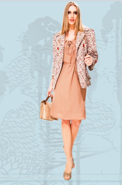 Pudra elbise şık çiçekli bir ceketle kombin edilmiş..