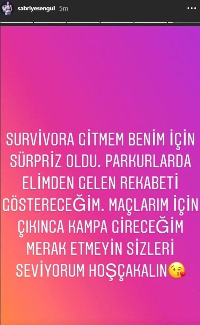Acun’un bahsettiği bu ismin daha önce de yarışan Türk Kickboksçu Sabriye Şengül olduğu ortaya çıktı. Bu haberi Instagram hesabından duyuran Şengül, ‘Survivor’a gitmem benim için de sürpriz oldu. Parkurlarda elimden gelen rekabeti göstereceğim. Maçlarım için çıkınca kampa gireceğim. Merak etmeyin, sizleri seviyorum.’ ifadelerini kullandı.