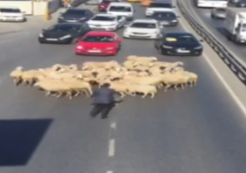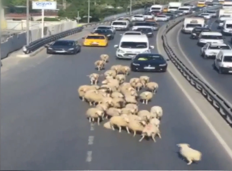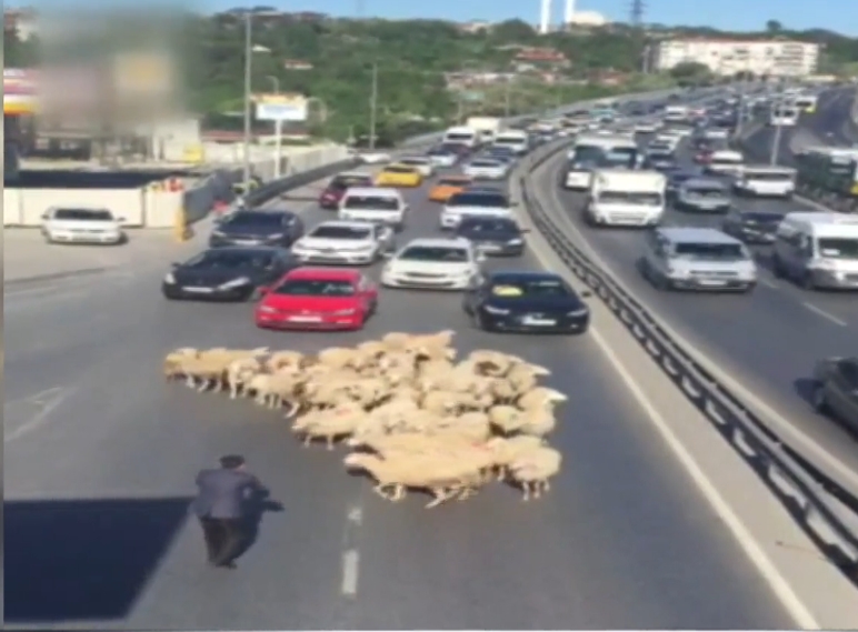 E-5 kapandı… Trafik durdu.. Çayır çimen bulamayan koyun sürüsü asfalta yayıldı. Bu görüntüler nedeniyle işe geç kalanlar ne diyeceğini şaşırdı. Görüntüler Küçükçekmece metrobüs durağı çevresinden. Otomobiller bir anda durmak zorunda kaldı. Çünkü yola giren koyunlar hiç acele etmeden önlerinde yürüyordu.