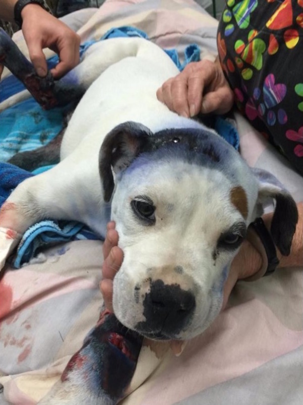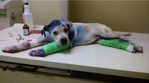 4 aylık yavru köpek Sammie Güney Karolina’daki bir veteriner kliniğine getirildiğinde bitmiş haldeydi. Sahibi köpeği kafasından vurmuştu. Daha sonra da üzerine boya dökerek aracının arkasında sürüklemişti.