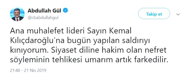 Twitter hesabından saldırıya yönelik tepki gösteren 11. Cumhurbaşkanı Abdullah Gül, “Ana muhalefet lideri Sayın Kemal Kılıçdaroğlu’na bugün yapılan saldırıyı kınıyorum. Siyaset diline hakim olan nefret söyleminin tehlikesi umarım artık farkedilir.” ifadelerini kullandı.
