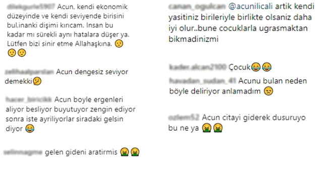 Itır Esen’in kısa sürede sosyal medyada yayılan videosuna ‘Acun dengesiz seviyor demek ki.’, ‘Gelen gideni aratırmış’, ‘Acun çıtayı giderek düşürüyor bu ne ya’ gibi yorumlar yapıldı.