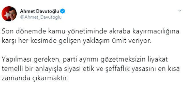 Yeni parti kuracağı konuşulan eski Başbakan Ahmet Davutoğlu, TBMM Başkanlığına sunduğu “Siyasi Etik Yasası” teklifine destek verdi. Akrabaların belediye işe alınmasıyla ilgili sosyal medyadan açıklama yapan eski Başbakan Ahmet Davutoğlu, “Yapılması gereken, liyakat temelli bir anlayışla siyasi etik ve şeffaflık yasasını en kısa zamanda çıkarmaktır” ifadelerini kullandı.