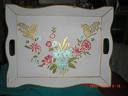 Ahşap boyama tekniği ile beyaza boyanmış bu tepsi,çiçek motifleri ile süslenip değer katışlmış.