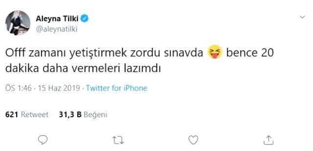 Dün üniversite sınavına giren Aleyna Tilki, Twitter hesabından yaptığı paylaşımda “Offf zamanı yetiştirmek zordu sınavda! Bence 20 dakika daha vermeleri lazımdı” diyerek sürenin yetersizliğinden şikayet etti.