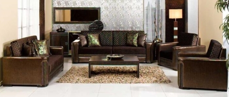 Kenarları deriden oluşmuş, parlak kırlentleriyle kehverengi tasarımlı Alfemo oturma grubu.