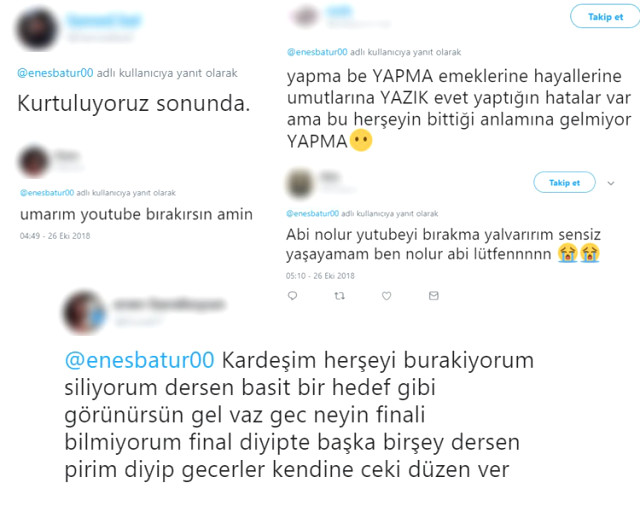 Amcasına kışkırtma videosunda sarf ettiği kırıcı ve oldukça ağır sözlerle hem sosyal medyada hem yazılı ve görsel basında büyük bir infiale sebep olan Batur’un, YouTube kariyerine son vereceği iddia edildi.