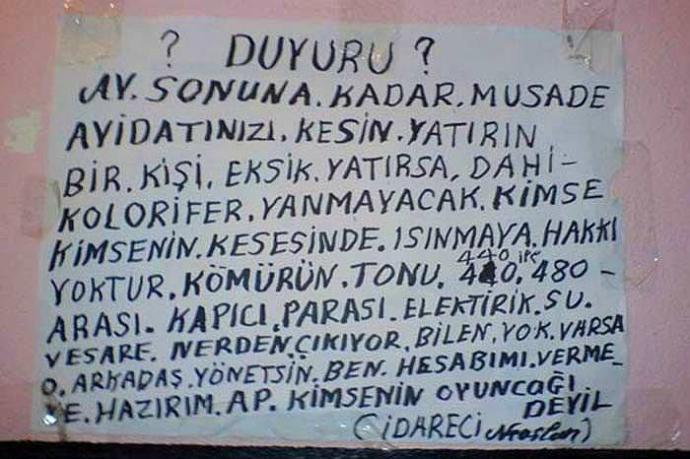 10 yıldır, aynı apartma oturuyorum, 20 kere yönetici değişti. Kim seçilirse mutlaka bir grup müttefiki, bir grupta karşı cephesinde olanlar vardır. Ne hikmetse zar zor o göreve birini bulurlar daha sonra da devirmek için elinden geleni yaparlar. Bizim apartmanda 20 daire var, hepsi denendi sıra bana geldi sanırım, her gün yolumu kesip yöneticimiz sen olsana diye adeta yalvarır tarzda rica ediyorlar ve ben bıkmadan hayır diyorum. Küçük bir araştırma yapınca en doğru kararı verdiğimi anlıyorum. Kimse yönetici olmaktan memnun değil anlaşılan. O kadar komik ilanlara rastladım ki sizlerle paylaşmak istedim.