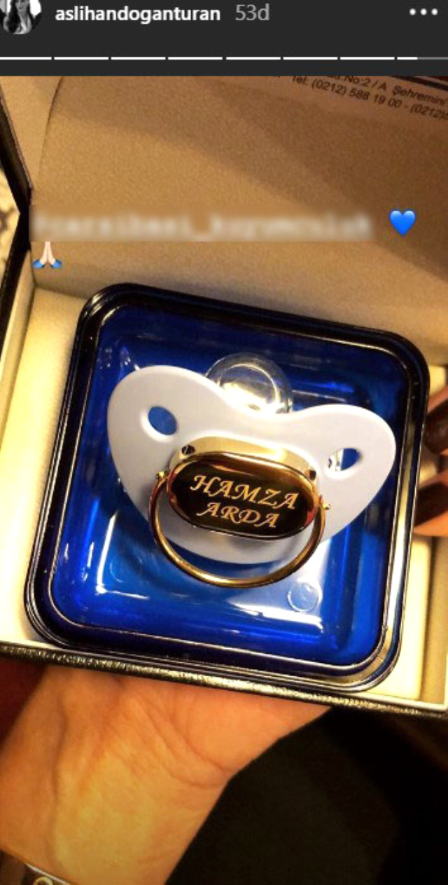 Sosyal medya hesabı Instagram’dan bebeklerine gelen emzik hediyesini paylaşan Aslıhan Doğan bebeğinin isminin ‘Hamza Arda’ olacağını doğrulamış oldu.