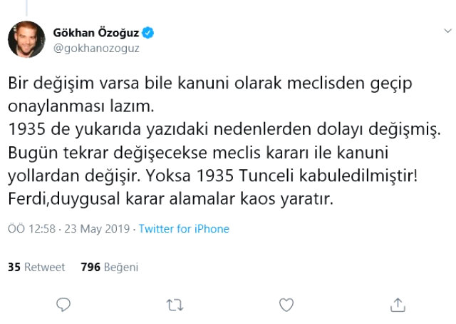 Son günlerde siyasi söylemleriyle gündem olan Gökhan Özoğuz, daha önce desteklediğiMaçoğlu ile bu açıklama sonrası ters düştü. Özoğuz Twitter hesabından “Bir değişim varsa bile kanuni olarak meclisden geçip onaylanması lazım. 1935 de yukarıda yazıdaki nedenlerden dolayı değişmiş. Bugün tekrar değişecekse meclis kararı ile kanuni yollardan değişir. Yoksa 1935 Tunceli kabul edilmiştir! Ferdi, duygusal karar almalar kaos yaratır” alınan kararın yerinde olmadığını dile getirdi.