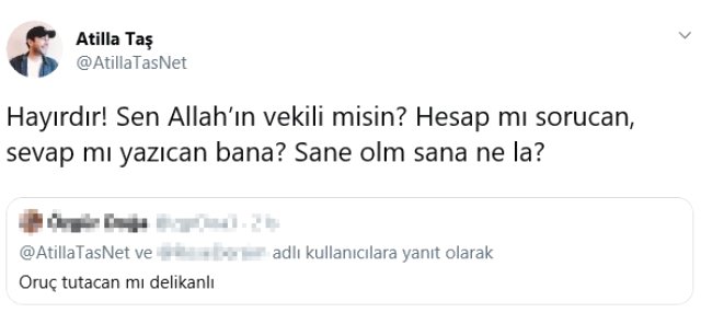 Razaman ayının başlaması sebebiyle bir takipçisinin “Oruç tutacan mı delikanlı?” sorusu Atilla Taş’ı kızdırdı. Taş, takipçisine “Hayırdır! Sen Allah’ın vekili misin? Hesap mı sorucan, sevap mı yazıcan bana? Sane olm sana ne la?” diyerek tepkisini gösterdi.
