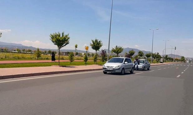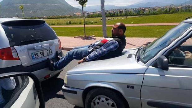 Görüntü Kayseri-Talas yolunda çekildi. Trafikte hareket eden bir otomobilin kaputunda bir adam uzanmış. Ayaklarıyla öndeki aracı itiyor.
