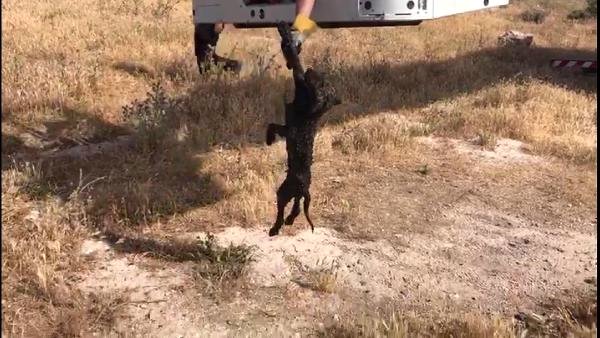 Bölgeye gelen itfaiye, yangın söndürme aracının merdivenini bataklığın içine doğru uzatarak ulaştığı yavru köpeği kurtardı. Çamurdan kurtarılan köpek, su ile yıkanarak bırakıldı.