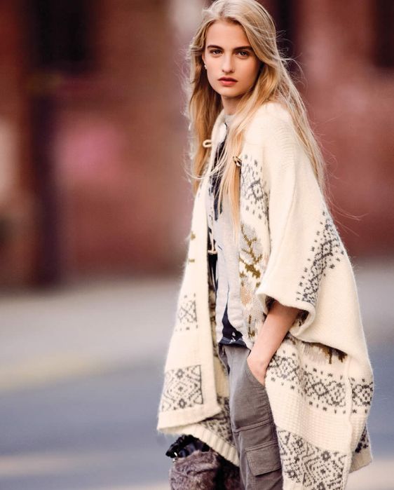 ((YAPILIŞI)8 nolu şişe 83 ilmek atalım 6 ilmik düz 1 ters 4′lü burgu 1 ters 5 düz 1ters 4′lü burgu 1 ters 5 düz 1 ters 4′lü burgu 1 ters 1 5 düz 1 ters 4′lü burgu 1ters 5 düz 1 ters 4′lü burgu 1 ters 4′lü burgu 1 ters 4 düz yaparak modeli meydana getirelim 6 dizide bir 5 ilmiği sol şişin üstünde tutup geri dönün 10. dizide bir 10 ilmek kaldıktan sonra tekrar dönelim enli bölüm 160 cm olcak biçimde örüp kenardan ekleyelim Yakada 76 ilmik çıkaralım 16 cm kadar.