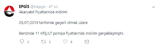 “05/07/2019 tarihinde geçerli olmak üzere benzinde 11 KRŞ/LT pompa fiyatlarında indirim gerçekleşmiştir.”