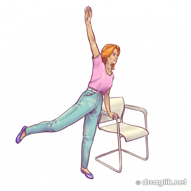 Sandalyenin arkasında durun ve sol elinizle sandalyenin arkasına veya koluna yaslayın.