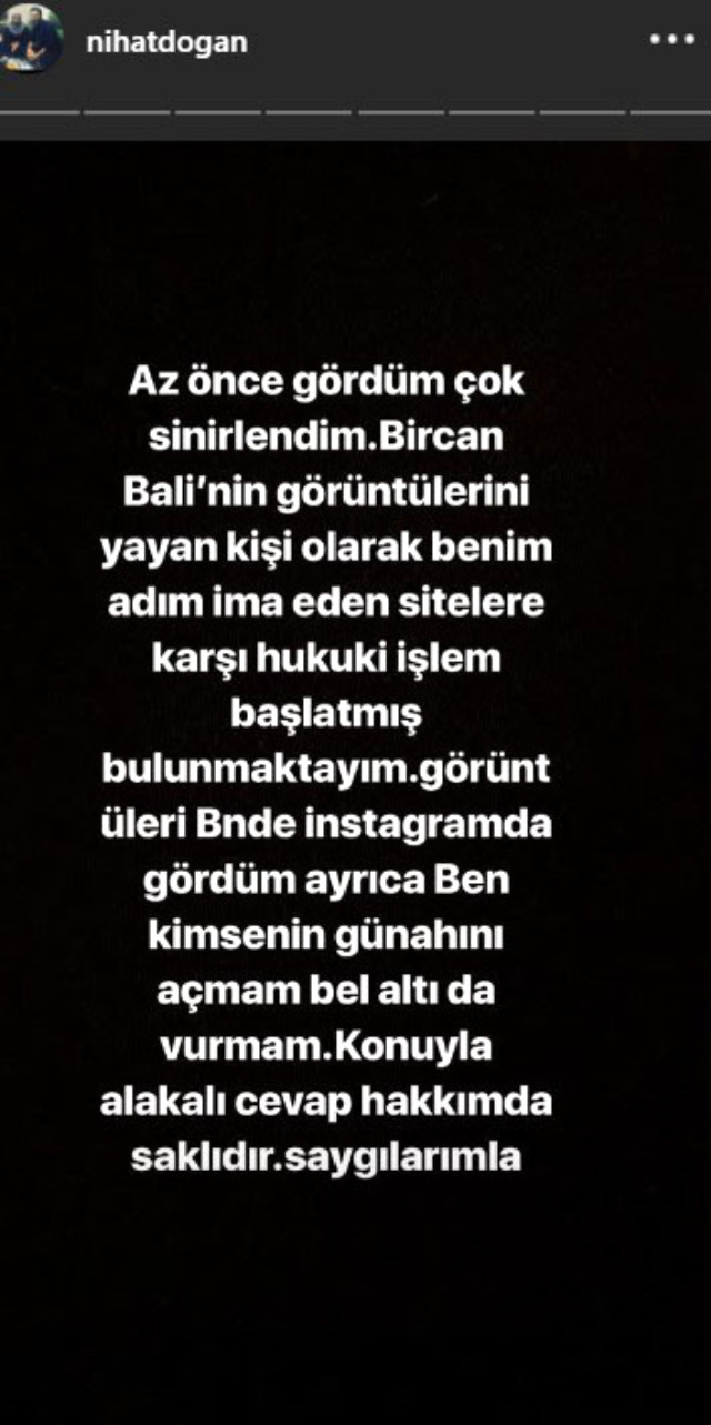 Hakkındaki suçlamalarla ilgili Instagram hesabından açıklama yapan Nihat Doğan, “Az önce gördüm çok sinirlendim. Bircan Bali’nin görüntülerini yayan kişi olarak benim adımı ima eden sitelere karşı hukuki işlem başlatmış bulunmaktayım. Görüntüleri ben de Instagram’da gördüm. Ayrıca ben kimsenin günahını açmam bel altı da vurmam.” dedi.