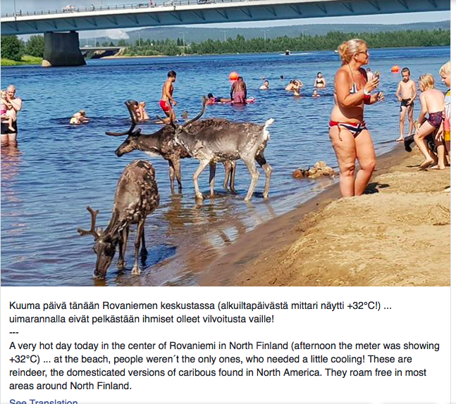Pekka, geyiklerin fotoğrafını çekik Facebook’ta paylaştı. Altına da, “Rovaniemi’de bugün hava 32 dereceydi. Serinlemek isteyen sadece insanlar değildi. Görmekte olduğunuz rengeyikleri de plaja geldiler” şeklinde bir açıklama ekledi.