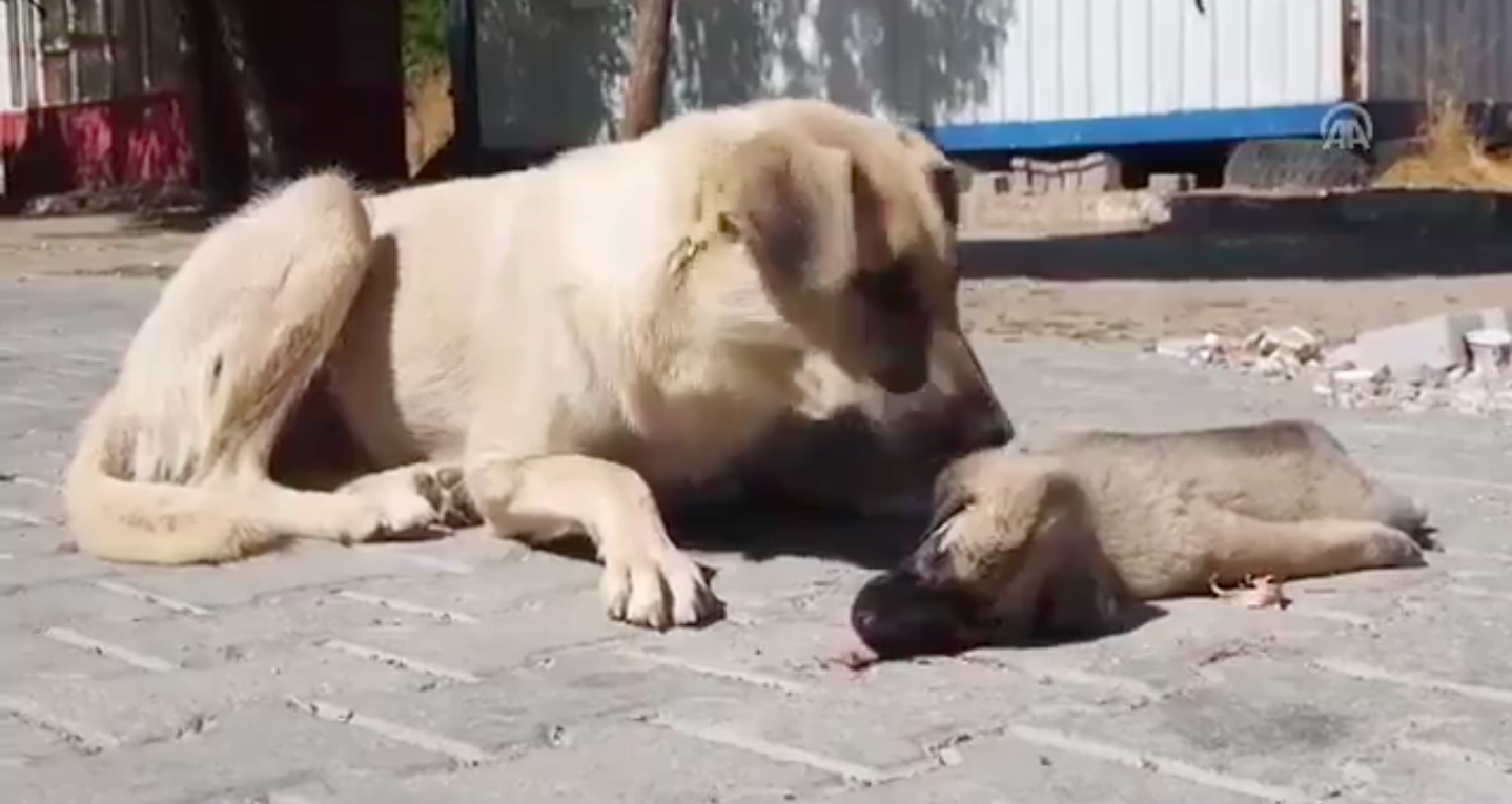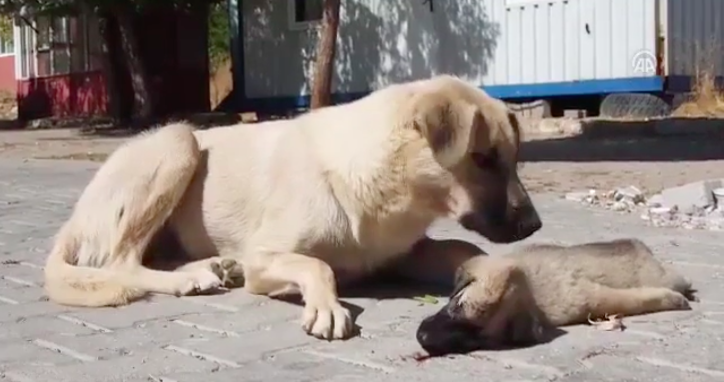 Bakıyor, biraz daha bakıyor, yaklaşıp dürtüyor hareket etsin diye… Ama yok… Yavrusu hareketsiz yerde yatıyor. Gidip yanına oturuyor, yalıyor yavrusunu ama uyandıramıyor… Anne köpeğin ölen yavrusunun başındaki görüntüleri izleyenleri ağlattı.