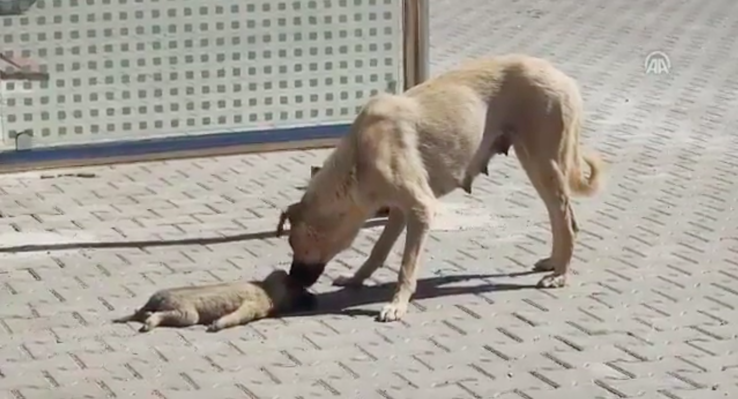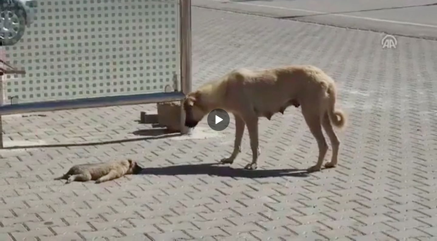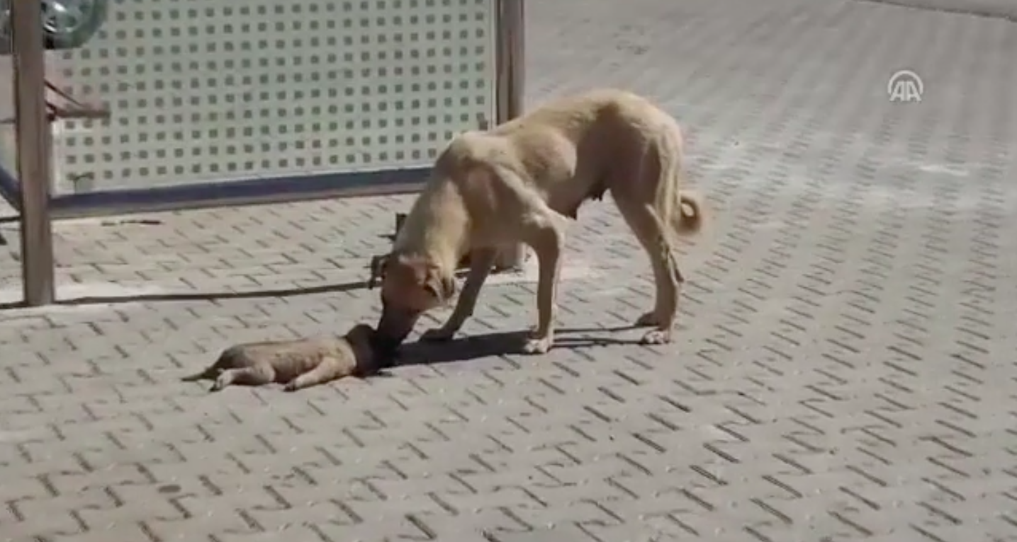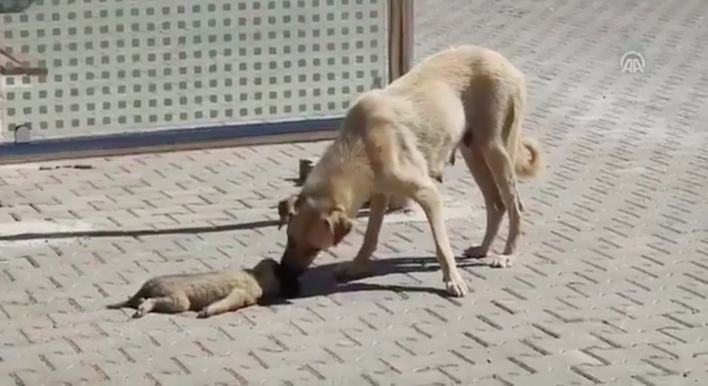 Bakıyor, biraz daha bakıyor, yaklaşıp dürtüyor hareket etsin diye… Ama yok… Yavrusu hareketsiz yerde yatıyor. Gidip yanına oturuyor, yalıyor yavrusunu ama uyandıramıyor… Anne köpeğin ölen yavrusunun başındaki görüntüleri izleyenleri ağlattı.