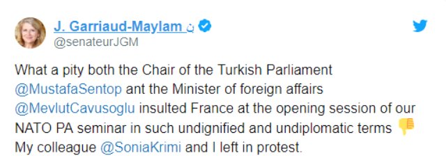Antalya’daki NATO toplantısında Dışişleri Bakanı Mevlüt Çavuşoğlu ile Fransız parlamenter Sonia Krimi arasında yaşanan “Ermeni soykırımı” gerginliğinde salonu terk eden diğer parlamenter Joelle Garriaud-Maylam sosyal medya hesabından olayla ilgili açıklama yaptı.