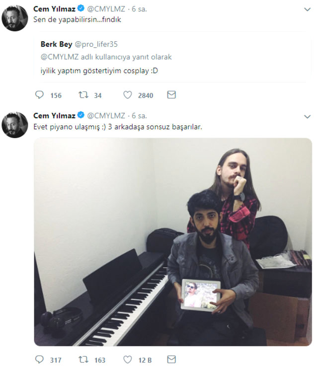 Ünlü komedyen Cem Yılmaz, Twitter hesabından söz verdiği takipçisinin istediğini yerine getirerek piyano hediye etti.