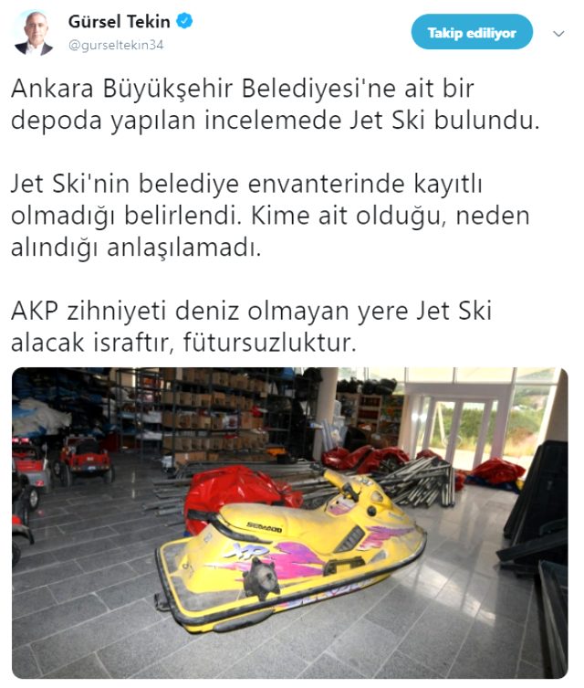 CHP’li Gürsel Tekin, Twitter hesabından yaptığı paylaşımda, Ankara Büyükşehir Belediyesi’ne ait bir depoda yapılan incelemede jet ski bulunduğunu belirtti.