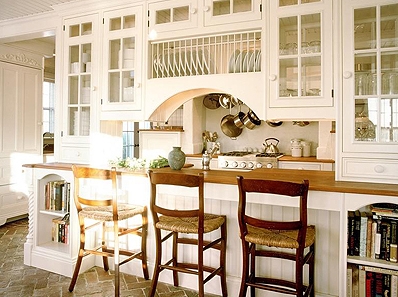 Country tarzında dekore edilmiş beyaz tasarımlı, ferah mutfak dizaynı.