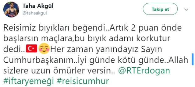 Dünya şampiyonu Taha Akgül, sosyal medya hesabından yaptığı açıklamada, ”Reisimiz bıyıkları beğendi.. Artık 2 puan önde başlarsın maçlara,bu bıyık adamı korkutur dedi. Her zaman yanındayız Sayın Cumhurbaşkanım..İyi günde kötü günde..Allah sizlere uzun ömürler versin.” ifadelerini kullandı.