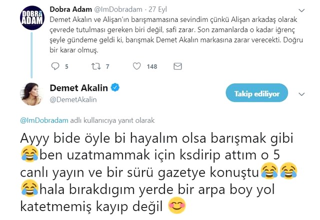 Bu açıklamanın ardından bir takipçisi Demet Akalın’a, “Alişan’la barışmamana sevindim” diye yazdı. Demet Akalın ise şu cevabı verdi: ”Hayalim olsa barışmak gibi, ben uzatmamak için kestirip attım. O canlı yayın ve gazeteye konuştu. Hala bıraktığım yerde bir arpa yol katetmemiş, kayıp değil.”