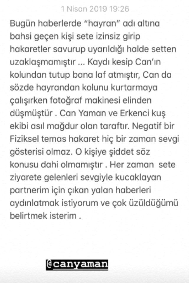 Sosyal medya hesabından açıklama yapan Demet Özdemir, “Bugün haberlerde “hayran” adı altında bahsi geçen kişi sete izinsiz girip hakaretler savurup uyarıldığı halde uzaklaşmamıştır… Kaydı kesip Can’ın kolundan tutup bana laf atmıştır. Can da sözde hayrandan kolunu kurtarmaya çaılışırken fotoğraf makinesi elinden düşmüştür.” ifadelerini kullandı.