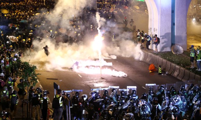 Pazar günü binlerce gösterici, düzenledikleri yürüyüşün ardından Çin’in Hong Kong’daki idare binasına doğru ilerlemiş; göstericilerin binaya yumurta atıp duvarlarına slogan yazması üzerine polis müdahalede bulunarak göz yaşartıcı gaz ve plastik mermi kullanmıştı.