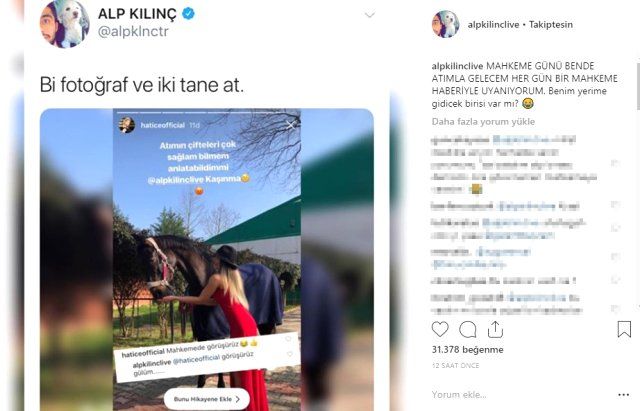Alp Kılınç daha sonra Instagram hesabından Hatice’nin kendisi için yazdığı “Atımın çifteleri çok sağlam bilmem anlatabildim mi Alp Kılınç kaşınma” fotoğrafını “Bir fotoğraf ve iki tane at. Mahkeme günü ben de atımla geleceğim. Her gün bir mahkeme haberiyle uyanıyorum.” yorumuyla paylaştı.