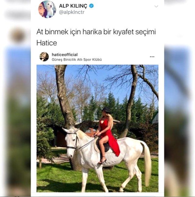Sosyal medya fenomeni Alp Kılınç ise Hatice’nin at bindiği fotoğrafı paylaşarak “At binmek için harika bir kıyafet seçimi” yorumunu yaptı. Yorumu gören Hatice, Kılınç’a “Mahkemede görüşürüz” dedi. Kılınç ise Hatice’ye “Görüşürüz gülüm” cevabını verdi.