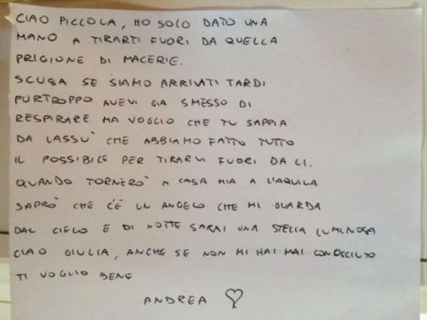 Enkazın altında 8 yaşındaki Giula Rinaldo da vardı. Görevliler 16 saat sonra kıza ulaştıklarında, küçük kız maalesef nefes almıyordu.