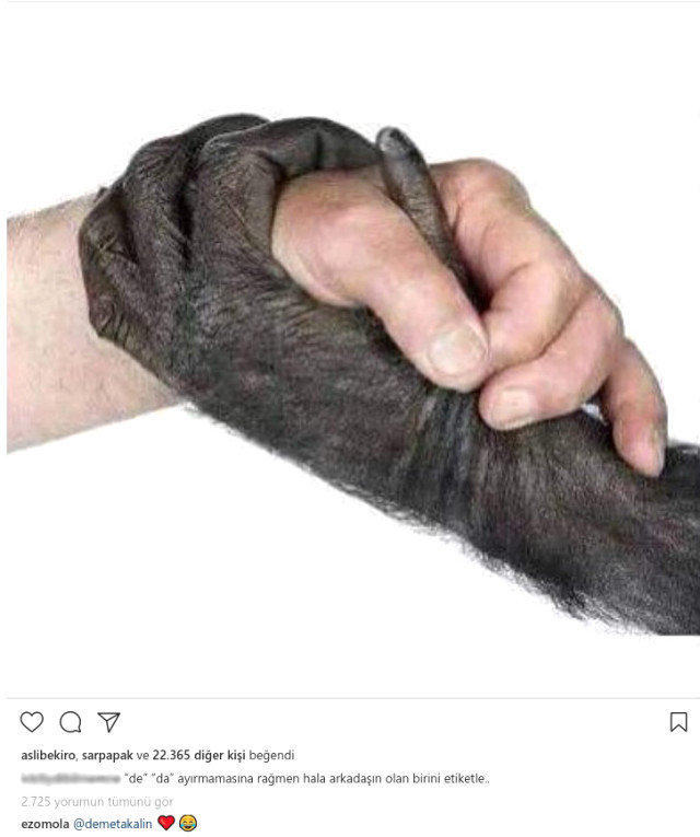 Demet Akalın’ın Türkçe ile olan imtihanı yakın arkadaşı Ezgi Mola’nın da dikkatini çekmiş durumda. Akalın’ın yaptığı imla hataları sosyal medyada alay konusu olurken, Instagram’da komik içeirkler paylaşan bir sayfanın “de” “da” ayırmamasına rağmen hala arkadaşın olan birini etiketle” gönderisine Demet Akalın’ı etiketleyen Ezgi Mola takipçileri kahkahaya boğdu.