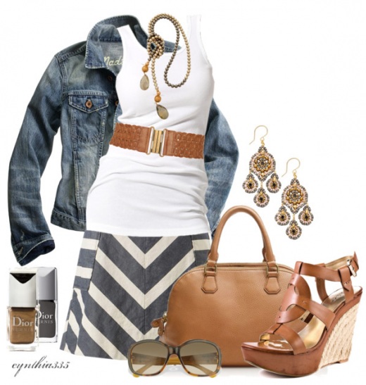 Gri beyaz çizgili etek beyaz askılı badi ve kahverengi kemer kombin üzerine kot ceket kombinine birde kahverengi topuklu sandalet eklenince çok daha güzel bir kombin çıkıyor ortaya