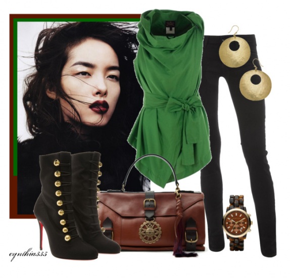 Yeşil çok hoş tunik modeli altına koyu renk dar paça pantolon ve çivi topuk siyah bot harika bir kombin bayanlar