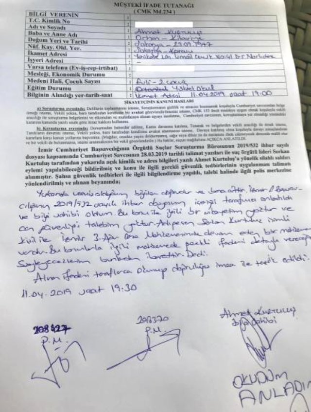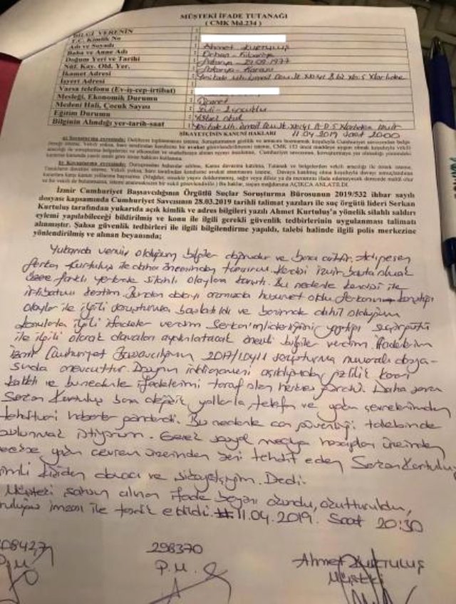 “… sayılı ihbar olayının içeriği tarafıma anlatıldı ve bilgi sahibi oldum. Bu konuyla ilgili bir şikayetim yoktur ve can güvenliği talebim yoktur. Adı geçen Serkan Kurtuluş isimli kişi ile İzmir 3. Ağır Ceza Mahkemesinde devam eden bir mahkeme vardır. Bu konularla ilgili mahkemede gerekli ifademi detaylı vereceğim. Söyleyeceklerim bundan ibarettir.”