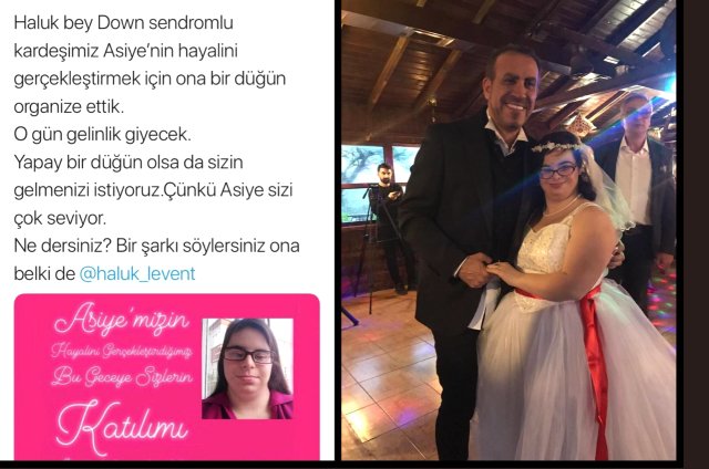 Ünlü şarkıcı, “Haluk bey, Down sendromlu kardeşimiz Asiye’nin hayalini gerçekleştirmek için ona bir düğün organize ettik. O gün gelinlik giyecek, yapay bir düğün olsa da sizin gelmenizi istiyoruz. Çünkü Asiye sizi çok seviyor” paylaşımını görünce harekete geçti.