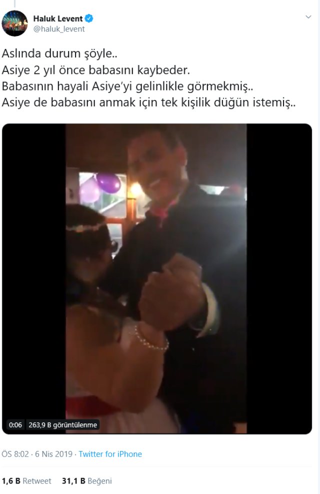 Levent, 2 yıl önce babasını kaybeden Asiye’nin hayali düğününe katılıp onunla dans ettiği videoyu sosyal medya hesabından paylaştı.