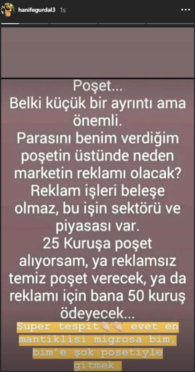 Instagram hesabının hikaye bölümünden paylaşım yapan Hanife, “Poşet belki küçük bir ayrıntı ama önemli. Parasını verdiğim poşetin üstünde neden marketin reklamı olacak. Reklam işleri beleşe olmaz, bu işin sektörü ve piyasası var. 25 kuruşa poşet alıyorsam ya reklamsız temiz poşet verecek ya da reklamı için bana 50 kuruş ödeyecek…” ifadelerini kullandı.