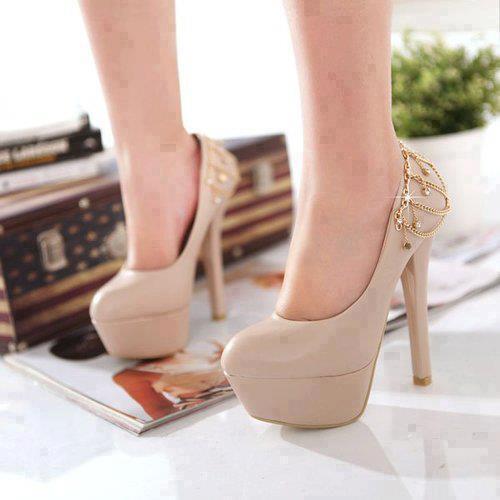 bej zincir detaylı yüksek topuklu ayakkabı modeli
