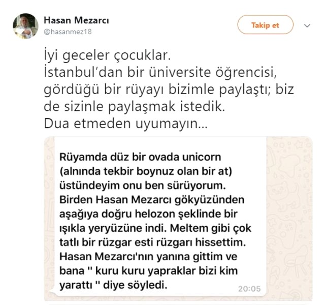 2000’li yılların başında kendisini “Mesih” ilan eden eski Refah Partisi milletvekili Hasan Mezarcı ise böyle bir dönemde, sosyal medya hesabından dikkat çekici paylaşımlarda bulundu. Mezarcı, “İyi geceler çocuklar. İstanbul’dan bir üniversite öğrencisi, gördüğü bir rüyayı bizimle paylaştı; biz de sizinle paylaşmak istedik. Dua etmeden uyumayın…” dedi ve kendisine gelen bir mesajı paylaştı.
