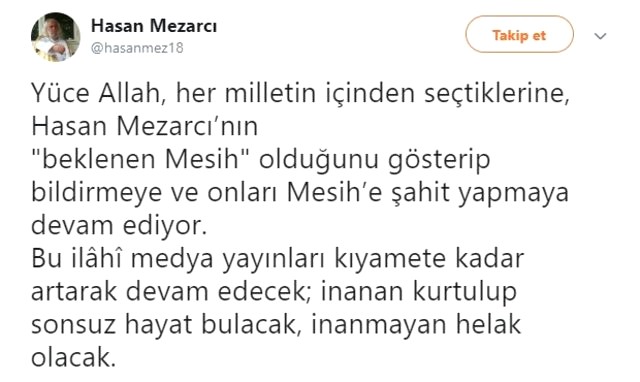 2000’li yılların başında kendisini ‘Mesih’ ilan eden eski Refah Partisi Milletvekili Hasan Mezarcı, medyanın kendisine yer vermediğini öne sürerek, Twitter hesabından “Bu ilâhî medya yayınları kıyamete kadar artarak devam edecek; inanan kurtulup sonsuz hayat bulacak, inanmayan helak olacak” mesajını paylaştı.