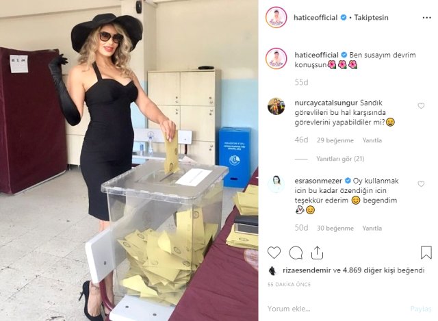 Son olarak bir defilede kalçasını açarak gündeme gelen Hatice’nin son paylaşımı yine olay oldu. Oy kullanmak için okula giden Hatice, baştan aşağı simsiyah giyindi. Şarkıcı, siyah büyük şapka, gözlük, siyah uzun eldiven, topuklu ayakkabı ve siyah elbisesiyle tüm dikkatleri üzerine çekti. Hatice, sandık başında çektirdiği fotoğrafını da “Ben susayım devrim konuşsun” notuyla paylaştı.