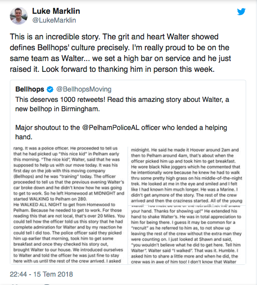 Paylaşımı kısa sürede yayıldı ve Bellhops’un CEO’su Luke Marklin’e ulaştı.