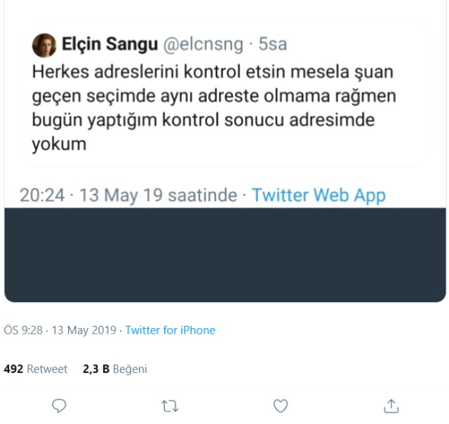 Ekrem İmamoğlu’na verdiği destekle gündemde olan güzel oyuncu Elçin Sangu, dün twitter hesabından”Herkes adreslerini kontrol etsin mesela şuan geçen seçimde aynı adreste olmama rağmen bugün yaptığım kontrol sonucu adresimde yokum” uyarısını yapmıştı.