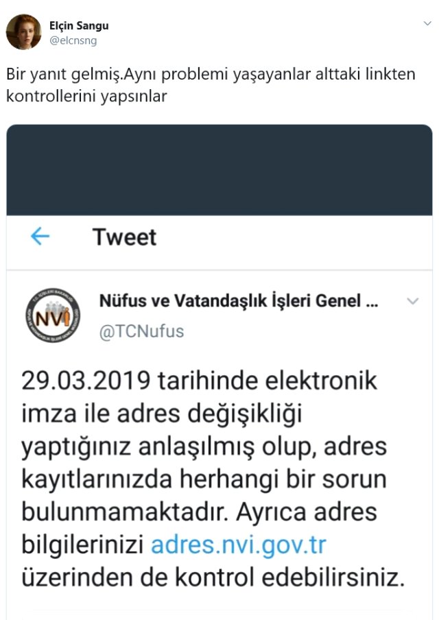 Ünlü oyuncu Elçin Sangu, sosyal medya hesabından “Herkes adreslerini kontrol etsin” paylaşımını yapmıştı. Sangu’ya Nüfus ve Vatandaşlık İşleri Genel Müdürlüğü yanıt verdi.